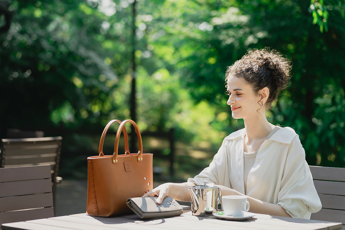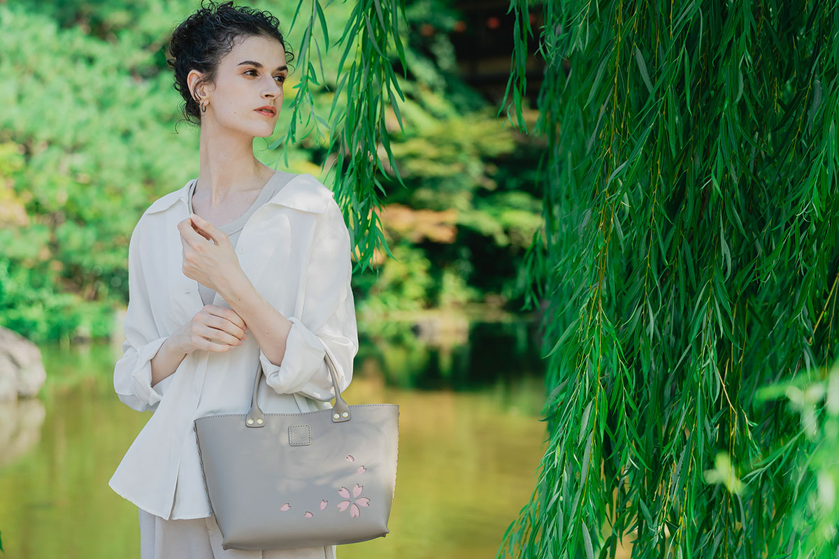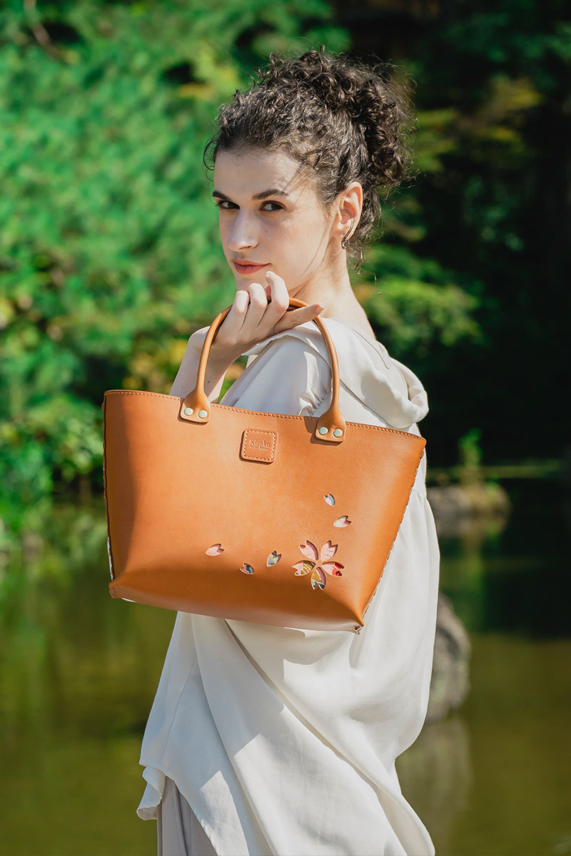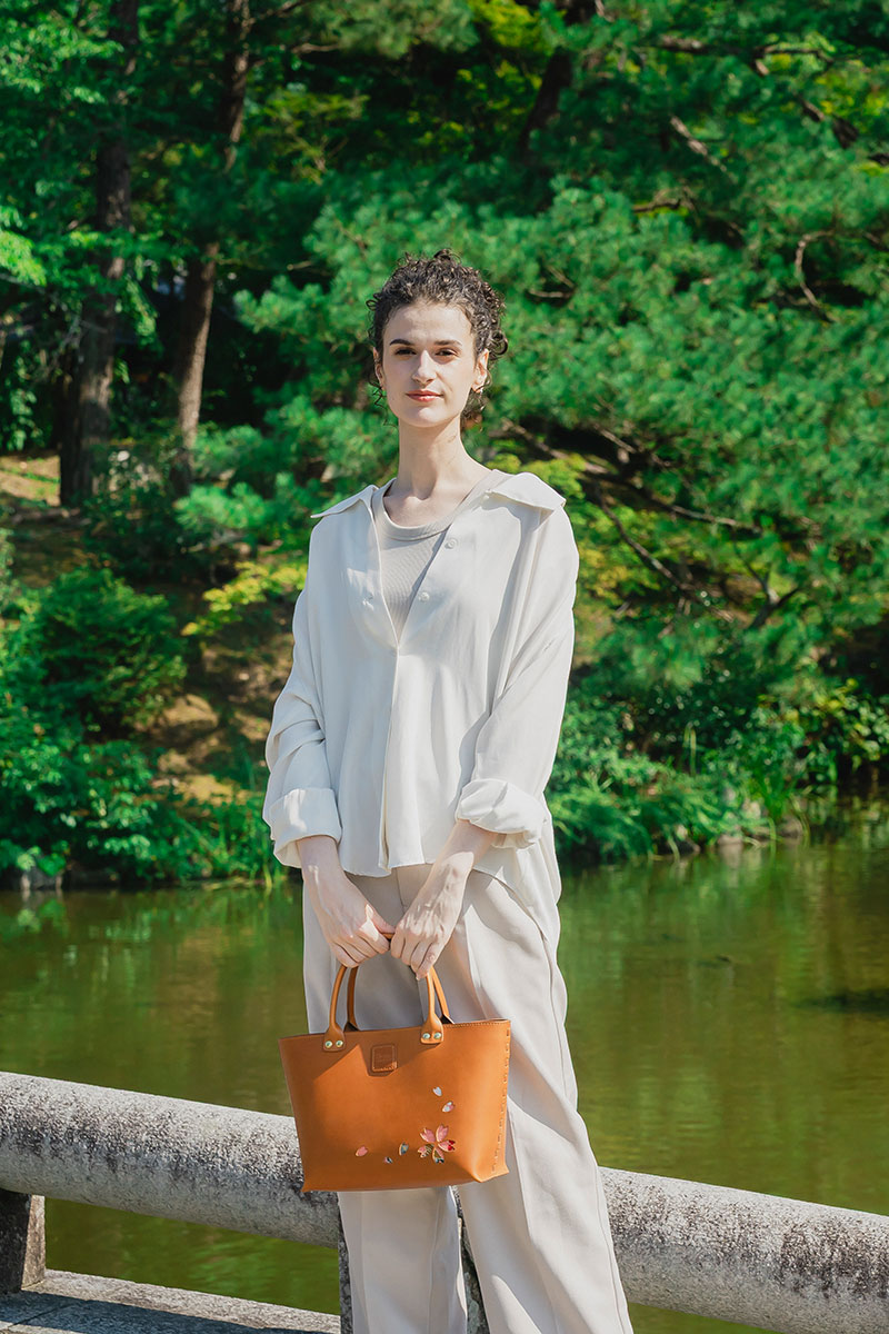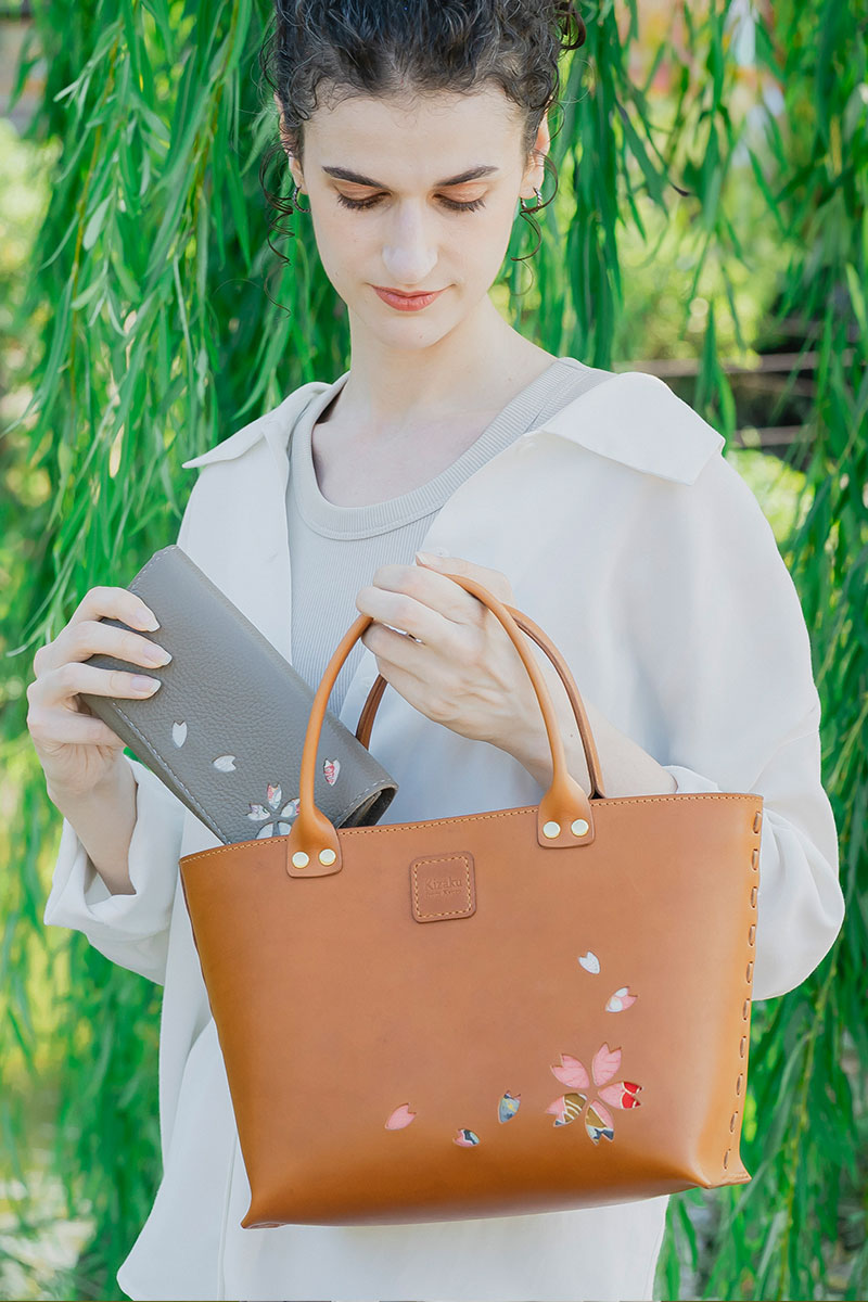 Kizaku bags are crafted by upcycling unused kimonos, which are used for the embossed cherry blossom sections and the bag’s inner lining. Each piece is entirely unique in its colors and patterns — a true one-of-a-kind creation.
