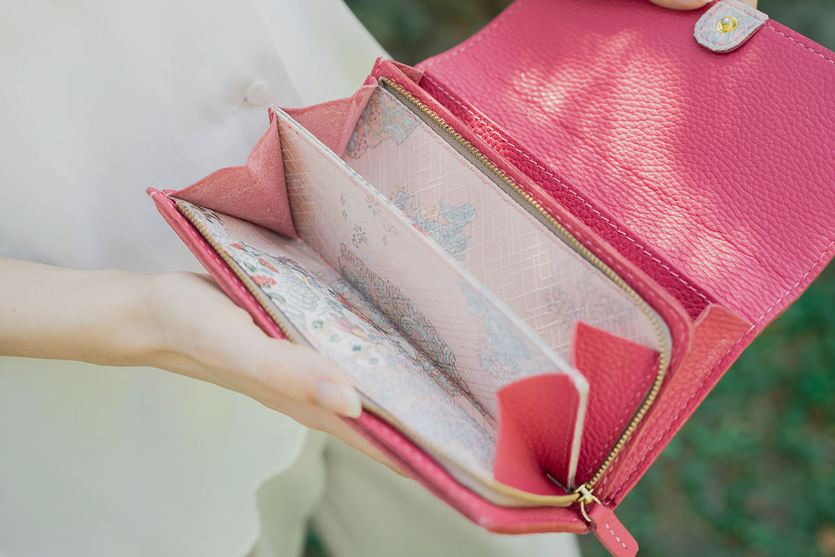 Alongside the bags, Kizaku also offers wallets made from the same upcycled kimono fabric. These wallets are made to order — please feel free to contact us for inquiries.