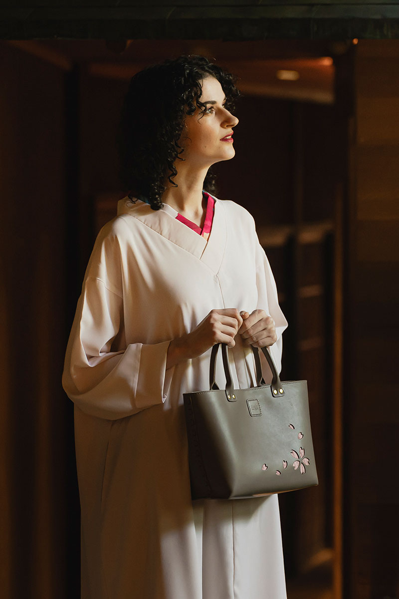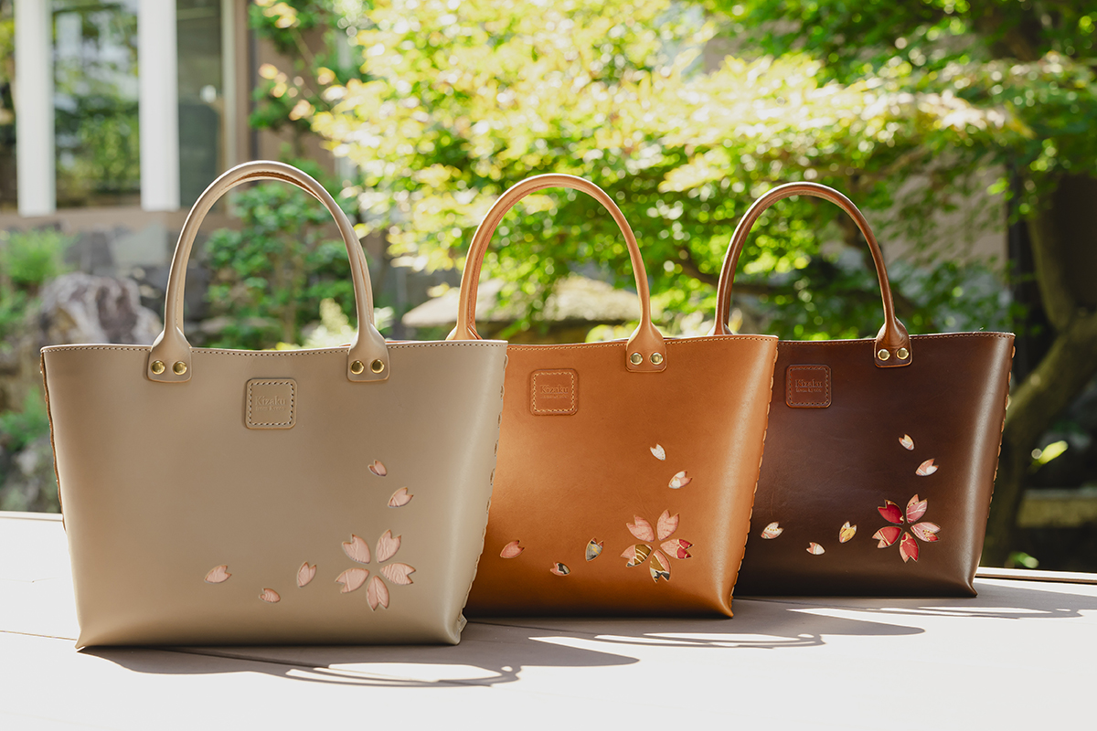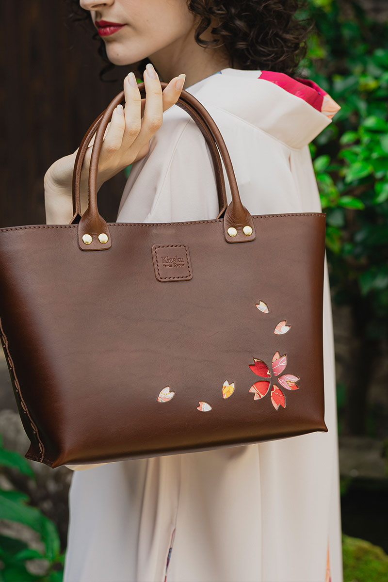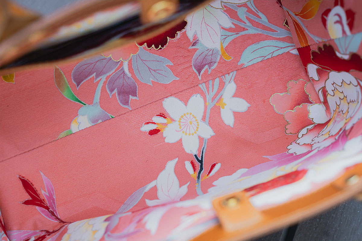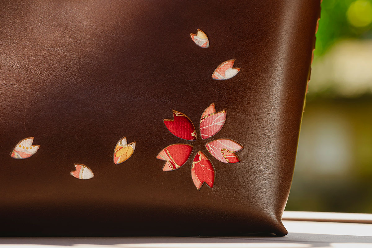 Kizaku bags are crafted by upcycling unused kimonos, which are used for the embossed cherry blossom sections and the bag’s inner lining. Each piece is entirely unique in its colors and patterns — a true one-of-a-kind creation.
